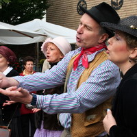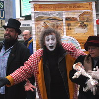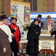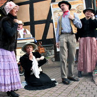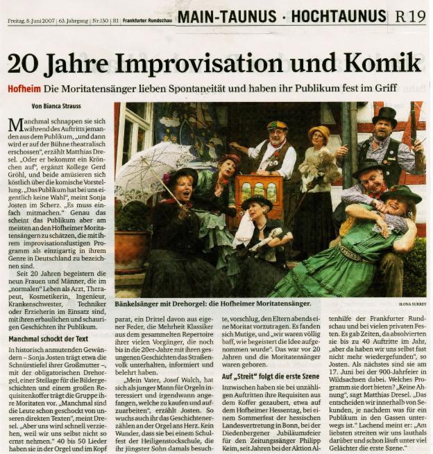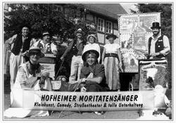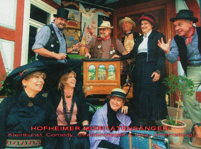 Die Hofheimer Moritatensänger: "In dem hessischen Städtchen Hofheim hat sich im Jahr 1987 eine Gruppe geründet, die bei Stadtfesten und anderen Veranstaltungen berühmte und selbstgedichtete Moritaten mit Drehorgeln und Moritatentafeln vorträgt. Mittlerweile hat die Gruppe viele Freunde."
